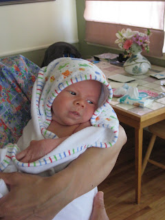 The rest of the past week was actually pretty packed, as Sara managed to plan something or other for almost every day. On Tuesday she went to her first mommy and me class, where Connor was a model student by sleeping through nearly the entire two and a half hours; Tuesday night saw Sara's boss and his wife stop by for about an hour; Wednesday Sara went in to her office for lunch and introduced her coworkers to the little guy, and as we recapped later Connor was passed around between all the women and all the men with children, but all the single guys or guys without kids managed a quick pat on the head and a "No, I don't want to hold him when so many other people are so eager" (and to think that was me about 6 weeks ago); Thursday Sara went down to Orange County for the day, their first big car ride just the two of them, and Connor got to meet Kara, Alaina, Iris and Patsy; and on Friday Connor had a big photoshoot as Sara and I try to figure out birth announcements, which I'm sure we'll have out before he turns 1 year old.